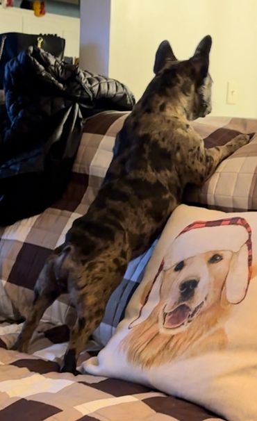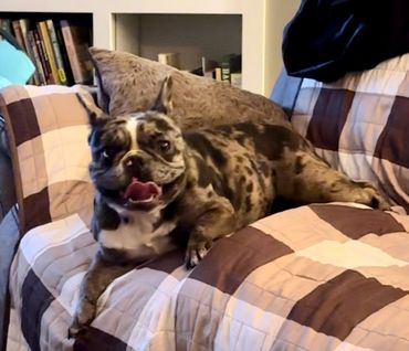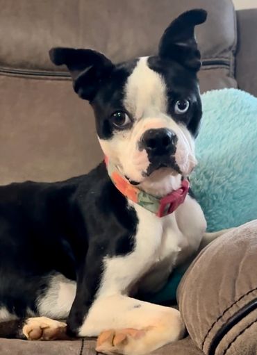 Beautiful 30lb Black & White Female w/ unique Blue Eye. Cassidy loves everyone and just melts when you love on her. Sheβs an amazing mama. When bred to a Frenchie, pups have amazing heads & confirmation with the best qualities of both parents. Her babies are in the middle of mom & dad. Gotta love Frenchton puppies!