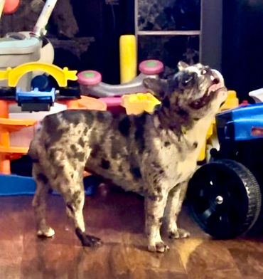 21lb Black Merle Female Frenchie. Such a unique girl with her half blue eye -- What is the rarest color for a French Bulldog? Merle. Merle dogs have the most unique coats among the French Bulldogs. Sasha has an excellent compact conformation with open nares and is super sweet and loving.